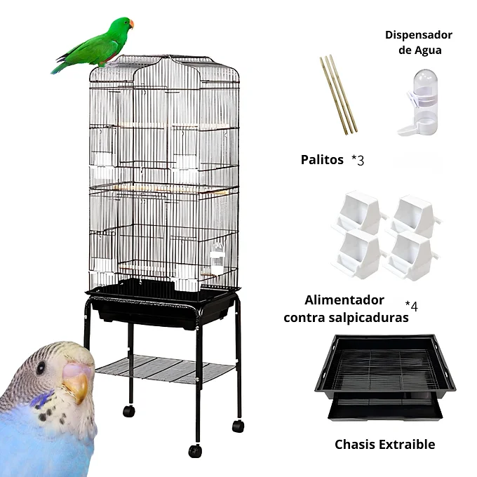 ¿Buscas una jaula para aves resistente, funcional y decorativa? Nuestra jaula metálica con soporte y ruedas es perfecta para agapornis, canarios, pericos, ninfas y aves medianas. Con diseño espacioso y accesorios incluidos, brinda comodidad y bienestar a tus pájaros, ¡y facilidad a tu rutina!