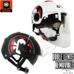 Fabricado en policarbonato resistente, este casco media cara cuenta con un práctico visor abatible que te protege del viento y el sol, facilitando su uso en diferentes condiciones. Su cierre micrométrico asegura un ajuste rápido y seguro, ideal para quienes valoran la comodidad sin perder protección.