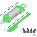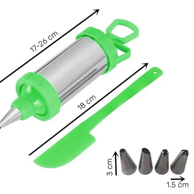 Fabricada en acero inoxidable resistente, con detalles en color verde que aportan estilo, esta jeringa decoradora incluye pala y 4 boquillas diferentes para lograr diseños únicos en tus pasteles, cupcakes, galletas o postres.