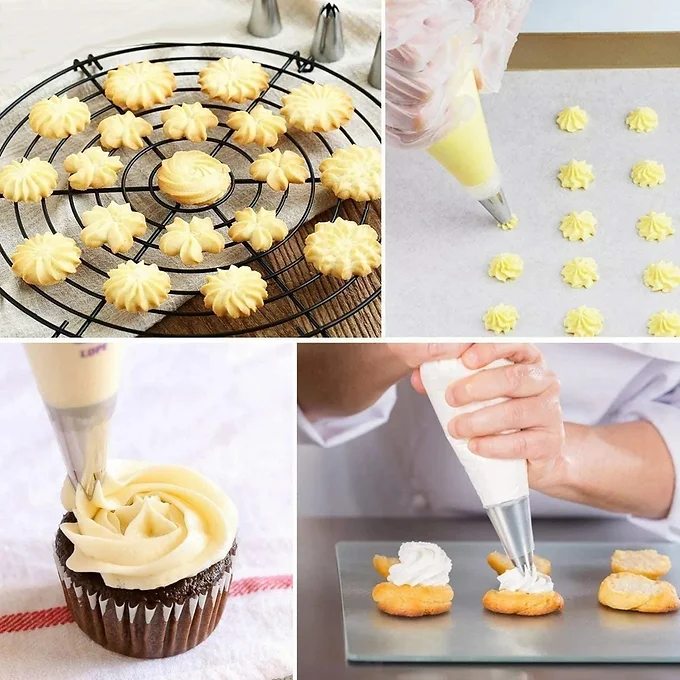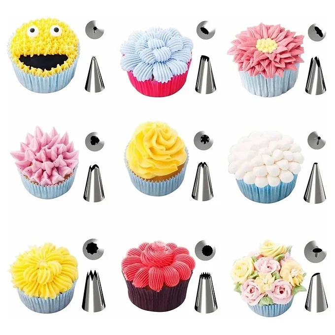 3. Herramientas de decoración de pasteles: diferentes puntas de tapado, acopladores, bolsillos reutilizables para tuberías, pinchos de flores y bolígrafos decorativos, puede crear una variedad de hermosos patrones en pasteles, pasteles y galletas.